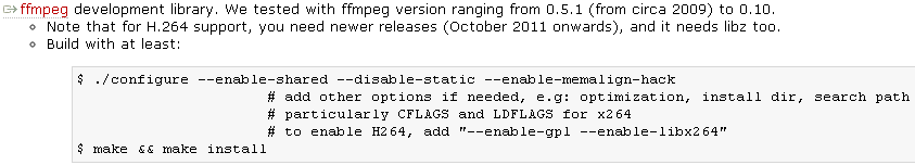./configure,make; make installto install. Addsudoif encountering privilege problems. - FFMPEG: reference the official FFMPEG documentation at https://ffmpeg.org/trac/ffmpeg/wiki/UbuntuCompilationGuide. Follow the guide to build yasm, x264 and ffmpeg. The ffmpeg version (0.10.6) and building process follow the pjsip guide.