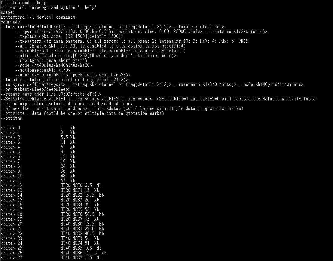 Atheros test tool ‘athtestcmd’: We have to insmod the driver with parameter ’testmode=1’ or we could not use this command.